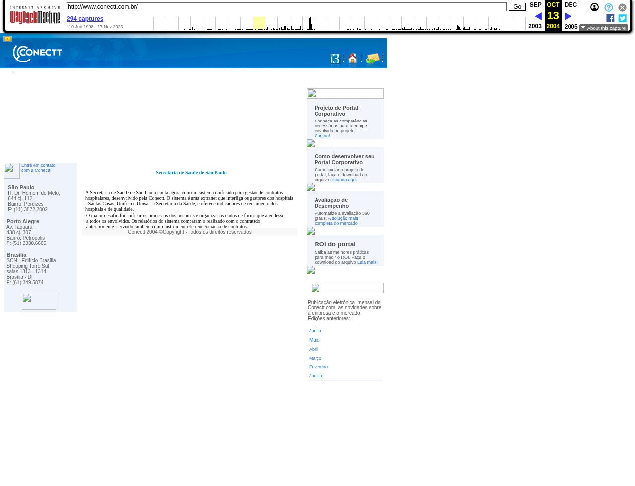 Este fragmento do site da Conectt mostra como os sites no começo dos anos 2000 eram bem simples e diretos. O fundo é branco, os textos são pequenos e quase não tem imagens. Os links aparecem em azul sublinhado, o que era bem comum naquela época. A página é toda montada com blocos e caixas, tudo muito reto e organizado de forma básica. O conteúdo é sério e fala sobre projetos com governos, como o sistema da Secretaria de Saúde de São Paulo. Isso mostra que o site era feito para empresas, e não para o público geral. A linguagem é técnica e sem muita emoção, focada em mostrar serviços de tecnologia. A primeira parte da página tem pouco conteúdo, o que hoje seria visto como um erro de design, mas na época era normal. O fragmento não foi muito bem preservado pois imagens e ícones não carregam, o que atrapalha um pouco a experiência.
