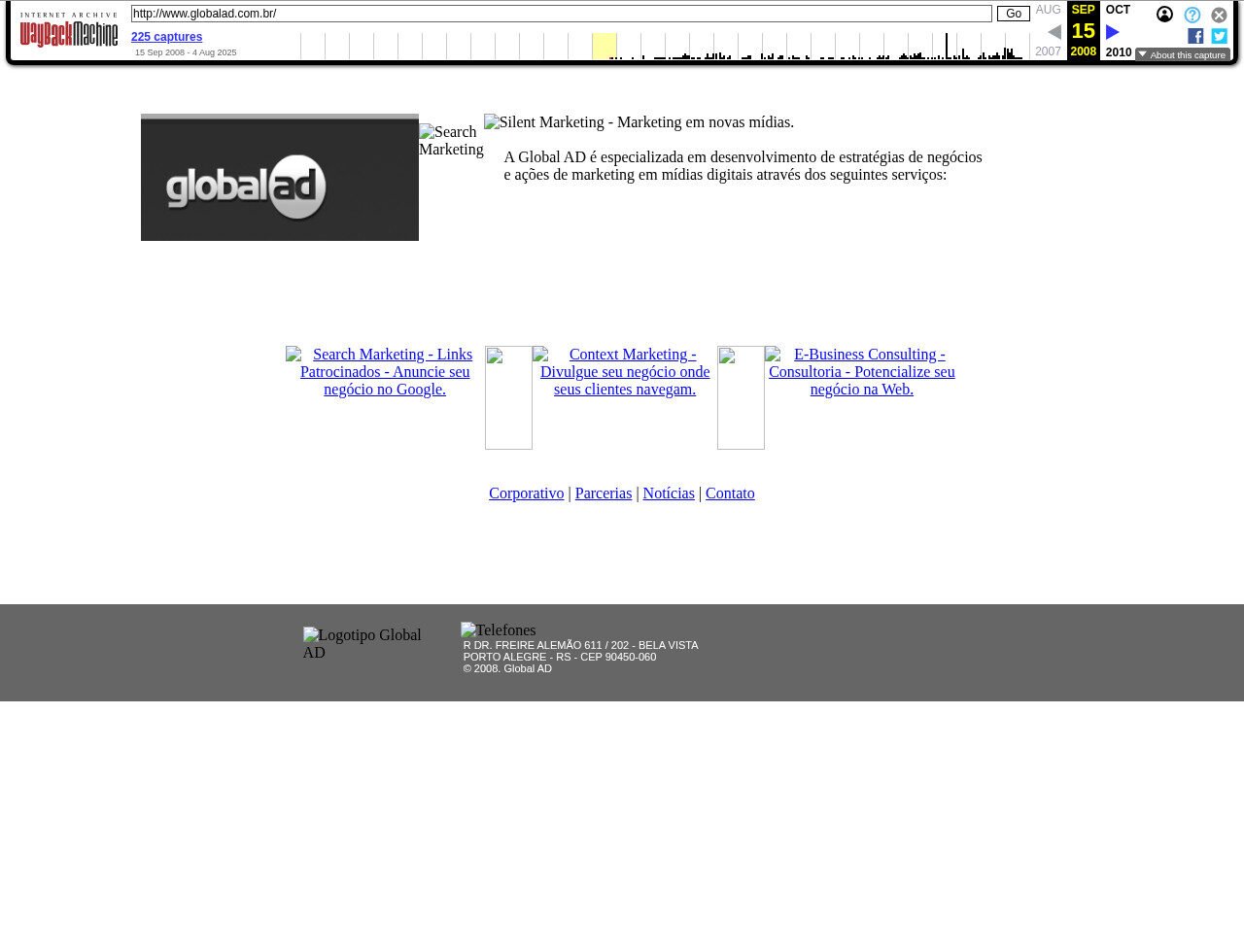 Este fragmento do site da Global AD mostra um estilo bem comum da internet no final dos anos 2000. A página é simples, com fundo branco, texto centralizado e quase nenhuma imagem funcionando. A empresa fala de marketing digital e tenta mostrar seus serviços como anúncios online e consultoria para negócios na internet. O visual é bem direto, sem enfeites, com links azuis no rodapé e blocos de texto explicando o que eles fazem. A linguagem é mais técnica, voltada para empresas, com frases que tentam mostrar que a marca entende de internet e quer ajudar outros negócios. Dá pra ver que o site foi feito para ser prático, sem muita preocupação com aparência. Vários elementos da página não aparecem porque as imagens estão quebradas, mostrando falas de preservação de longo prazo.