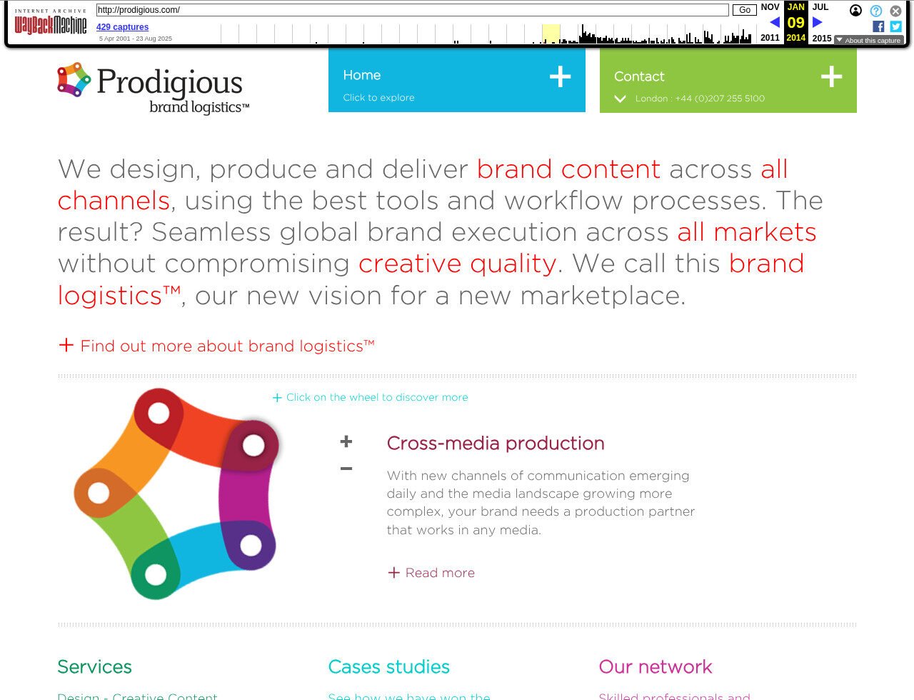 Este fragmento da Prodigious mostra bem como, no começo dos anos 2010, os sites começaram a mudar para um visual mais limpo e prático, pensado pra funcionar bem tanto no computador quanto no celular. A página tem muito espaço em branco, fontes fáceis de ler e tudo é dividido em blocos, o que deixa a navegação mais leve. O jeito de se comunicar é direto, usando palavras em destaque e cores fortes pra chamar atenção. Termos em inglês como “brand content” e “cross-media production” aparecem bastante, mostrando como as agências queriam parecer mais modernas e ligadas ao mercado global. O menu é simples e o gráfico em forma de roda ajuda a entender o que a empresa oferece, tudo com uma estética bem pensada. O site está bem preservado, com todos os elementos visuais funcionando.